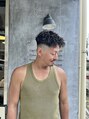サイドからバックにかけて肌が透けるほど刈り上げたハイフェードカットが特徴。トップには強めのスパイラルパーマを施し、動きとボリュームを出しています。ワイルドさと清潔感を両立した、夏にぴったりのストリートスタイルです。