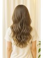 透明感のあるシアーベージュカラーと大きめのウェーブでやわらかく華やかなロングスタイル。
