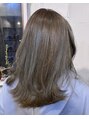 グレイヘアにハイライトとローライトを入れ、アッシュグレーをかぶせたミディアムスタイルです。しっかりと白髪を染めるのではなく、ファッションカラーでなじませています。