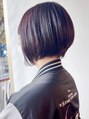 頭の骨格、お顔の形に合わせた前下がりショートボブです。襟足はスッキリ、顔まわりは長めになるのでお顔まわりを短くしたくない方に人気です。髪色はレッドブラウンです。