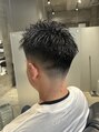 トップをシャープに立ち上げたスパイキーな束感に、0、3~1mmスタートのスキンフェードでサイドと襟足をタイトに締め、清潔感と男らしさを両立したフェードスタイルです。激しすぎないフェードを希望だったので、1mmまでのバリカンをミドルまでに設定。