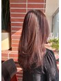 柔らかいピンクブラウンカラー。ブリーチなしです。顔まわりから後ろまでレイヤーを入れ動きをプラス。艶もあり、柔らかい色味と質感が女性らしさを引き立てます。