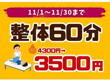 【土日祝も営業中◎】おかげさまで大好評♪ 11月限定!整体60分 3500円! ぜひご利用ください♪