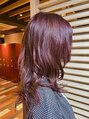 ビビットなピンクレッドカラーに顔まわりにレイヤーをたっぷり、トップは短くしないナチュラルウルフです。個性的な過ぎず、どんなファッションにも馴染みます