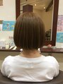 首がスッキリ見える切りっぱなしアゴラインボブ。前髪は作らず、シンプルにワンレングスでカットしました。子供っぽくならないきれいめボブです。ヘアカラーは明るめアッシュベージュをオン!まとまりやすさも抜群なおススメスタイルです。