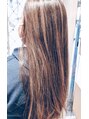 ハイライトで作るミルクティーベージュカラーです。巻いたり、くくっても可愛いヘアカラーです。色落ちしても上品になるように、太めと細めのハイライトをいれました。