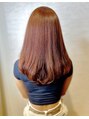 ブリーチなしのオレンジヘア。ダメージ最小限のイルミナカラーで色持ち◎顔周りだけたっぷりレイヤーを入れて動きを、後ろはワンレングスでパサつき防止。