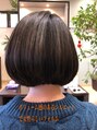 襟足ギリギリの前下がりボブ。今回のスタイルは敢えて重めに設定してあり、女性らしさのあるフォルムに仕上げてあります。
