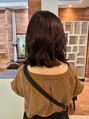 バイオレットブラウンでやや赤みを感じる落ち着いたカラー。暗めに染めても色味がわかりやすく、赤紫が入っているので艶感もしっかりと出てくれます。結べる長さのミディアムヘアと合わせました。