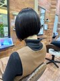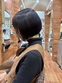 襟足ギリギリのラインで繋いだコンパクトボブ。やや丸みのあるシルエット、直線的なカットライン、面の艶感。シンプルだからこそこだわりのあるボブです。