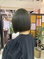 オリーブグレージュのタッセルボブ。オリーブ味のあるグレージュで透明感カラー。ブリーチ1回、もしくは明るめの状態なら可能。切りっぱなしのボブはキレイなカットラインがポイント。