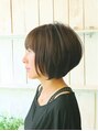 前下がりのボブスタイル。重くなりすぎないよう、表面にスライドカットを入れ、透け感を出しました。ラウンドバングで、目力と女性らしい甘さを演出しています。小顔効果のある前下がりボブにはしたいけど、女性らしい甘さも欲しいという方に最適です。