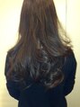 カットは肩下10センチのローレイヤー表面のみふんわり感がでるようにカラーは8トーンのマット系。仕上げに32ミリのコテでランダムに巻いています。