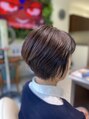 顔まわりと襟足に前下がりのラインでカットしたショートボブスタイルです。明るい白髪染めで重く見えない、秋らしいピンクブラウンで仕上げました。