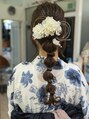 シニオン タマネギ ダウンスタイル 浴衣ゴム5本で簡単完成。首元に付かないように高めに髷を。肩・背中に付かないように内側を張り、表面は緩めています。下におろした毛束が外に反り返るようにしています。