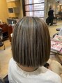 あごラインの切りっぱなしボブ!ハイライトをたくさん入れて、その他の部分はダークトーンにそめます!最後に紫シャンプーで洗えば黄ばみが取れてくっきりハイライトの完成!