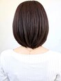 長めのミディアムショートスタイルです。前髪は丸く収まるようにカットして柔らかさを出すとともに小顔効果が期待出来ます。幼くなるのが苦手な方にもオススメです。