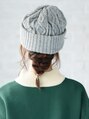 ニット帽を使ったカジュアルアレンジ。サイドを残した状態でハチ下でひとつにまとめる。両サイドの毛は真ん中にねじりながら留める。一束にした毛束はフィッシュボーンにし、全体を程よくほぐす。深くニット帽をかぶりすぎないのがポイント。