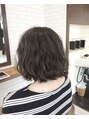 ブルーサファイアカラー。赤味やブラウン味をしっかり打ち消して、外国人風のグレイッシュカラーがオススメ。波打ちウェーブボブで軽やかさもプラス。[イルミナカラー][白髪染め]