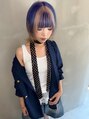 やわらかなミルクティーベースに、前髪へブルーパープルのローライトをプラス。さらにカチューシャのように繋がるデザインで、顔まわりを華やかに彩る個性派スタイル。ウルフレイヤーの軽やかな動きと透明感のあるカラーが、トレンド感と抜け感を引き立てます