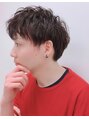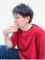 丸いシルエットは甘く見えやすいが、サイドとネープをタイトに刈り上げ、パーマでランダムな動きをつけることで男らしいタフなイメージに。