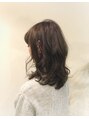 全体的に少し強めのパーマをかけて、動きを付けてあります。お手入れスタイリングも簡単な、ミディアムスタイルです。