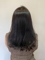 胸上ラインのワンレングスベースのロングヘア。重めなベースに中間からスライドカットする事で抜け感を。狭めバングにサイドの毛を流れるように作る事で顔の面積を小さく。暗めカラーでも重くなりすぎないようにモノトーンをセレクトして透明感をポイントに。