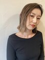 重めのワンレンスタイル。毛先の角を残すことでプツッとした切りっぱなし感を演出。水平より前下がりのライン設定でよりクールな印象に。ハイライト×グラデーションのブリーチカラーで外国人風のスモーキーベージュで明るめの印象に。