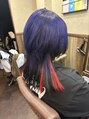 形の良いウルフヘアにカットし、毛先のブリーチ部分を利用して根元の黒が目立たないパープルカラーにしました。アレンジとして襟足耳後ろ部分にエクステでインナーメッシュで赤を入れて遊んでいます☆