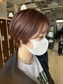 ピンクブラウンでカラーリングした丸みのあるショートカットです。お顔周りは軽めにしているので、髪の毛がお顔にかかっても気にならないですよ