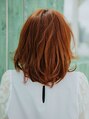 結べる長さの鎖骨レングスでレイヤーを入れてひし形シルエットに!!カラーは明るめのオレンジ系でツヤ感と軽さを出しています。前髪は薄めにして抜け感を◎レイヤーを短めに多めに入れているので動きがとても出るスタイルです!