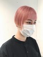 コンパクトなボブスタイルに、透明感のある淡いシャーベットピンクでカラーリングしたスタイルです。ケアブリーチを使用し髪へのダメージを最小限に抑え(枝毛・切れ毛を98%削減)シャーベットピンクをオンカラーしました。