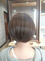 ベースのハイライトを活かしてグレージュ系のカラーリングで艶髪に。カットは内側を刈り上げてスッキリとした雰囲気にしました。
