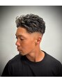 スキンフェードのツーブロック。メッシュとパーマを入れることにより、毛流れを強調し、立体感と奥行きを演出しました。