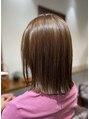 クセが少しあるので縮毛矯正をかけて、黄色っぽさを抑えたベージュ系のカラーで染めました/肩ギリギリ切りっぱなしボブをご希望だったのでその様に切らせて頂きました。