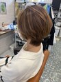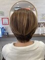 菱形ショートにハイライトで動きをつけてます。リタッチ部の伸びたところは時間の都合でそのままに、毛先のブリーチの名残を活かしてシャドルーツ風に仕上げてあります。ハイライトも襟足は太め~トップは細かめにしてあります。