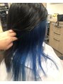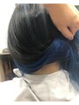 インナーカラーブリーチ2回からの明るいブルーカラー!髪を下ろすと控えめにチラ見え、しばるとしっかりブルーが見え、楽しめるカラーです♪