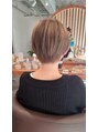 女性らしい丸みに爽やかな軽さを入れてカジュアルさをだし、襟足をつめて軽さの中にラインを感じるモードを入れたカジュアルモードなショートです。ブリーチし、オンカラーで柔らかなミルクベージュを入れています。