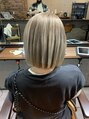 ブリーチを2回しっかりと行い、ライトベージュ系でオンカラー。カットは顎下1センチあたりの切りっぱなしボブ。量感調整もしてあります。