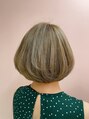 ブレンディングカラーで白髪をぼかしつつ、透明感のあるカラーで艶感アップ。大人の美しさを引き立てる、エレガントボブスタイルです。