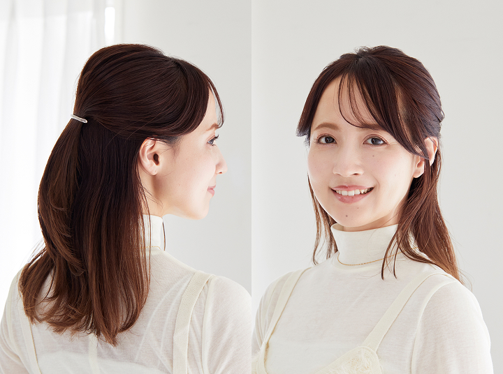 前髪はシースルーに。肌との隙き間を少し作ることで、さりげなく抜け感が生まれる。