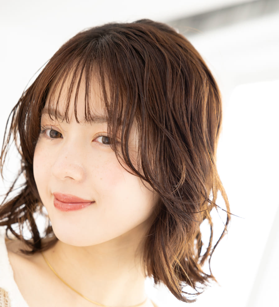 肩につくギリギリの長さで切りっぱなしカットをし、ライン感を残したまま外ハネベースでパーマをかけると、無造作なゆるっと質感に!