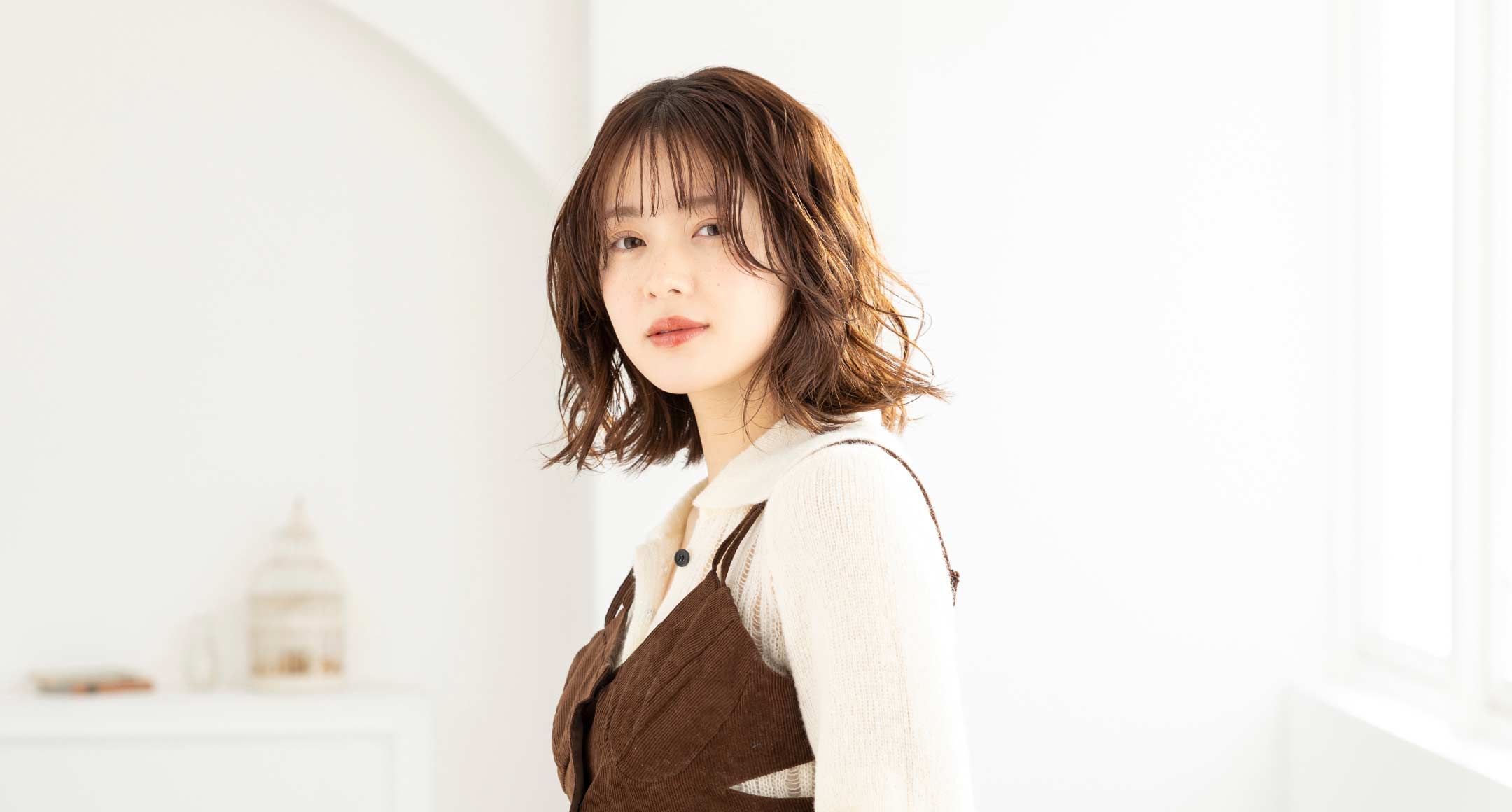 肩にギリギリつく長さで切りっぱなしにカット。顔まわりは頬の高さでワンカールに流れるように。