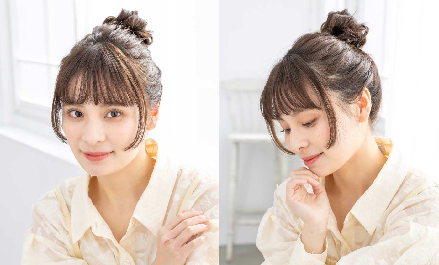 顔まわりの姫カット部分を残したおだんごに。少しほぐしてあげると抜け感が出る。前髪とおくれ毛は、32ミリのアイロンでカールをつけて柔らかく。