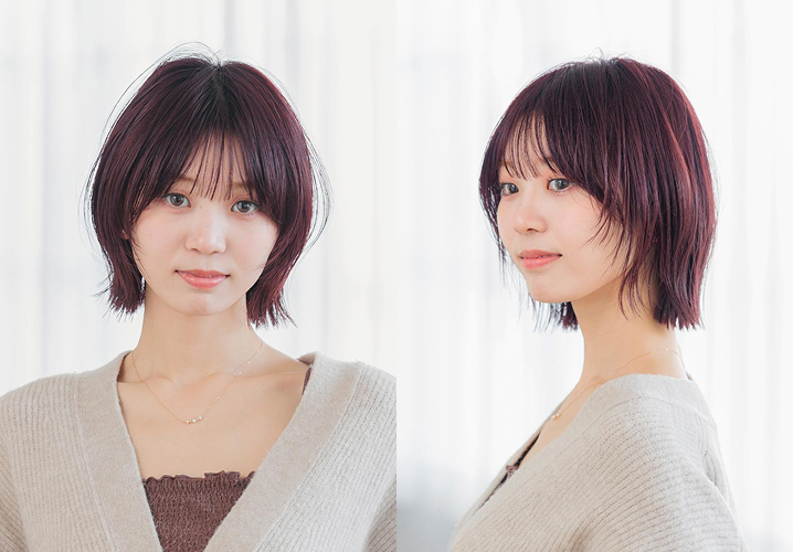 暗めのカラーにさりげなく可愛らしさを溶け込ませたような、絶妙なスタイルに注目。このヘアを担当してくれたのは、ABBEY2の戸谷 遥河さん。「ベースはシンプルなボブですが、ぱつっとしたラインのくびれボブで首元をキレイに見せ、大人可愛い雰囲気を引き出しました。ピンクバイオレットのカラーは、ダークトーンでも美肌見え効果あり。スタイリングはストレートアイロンだけで簡単にできます」。